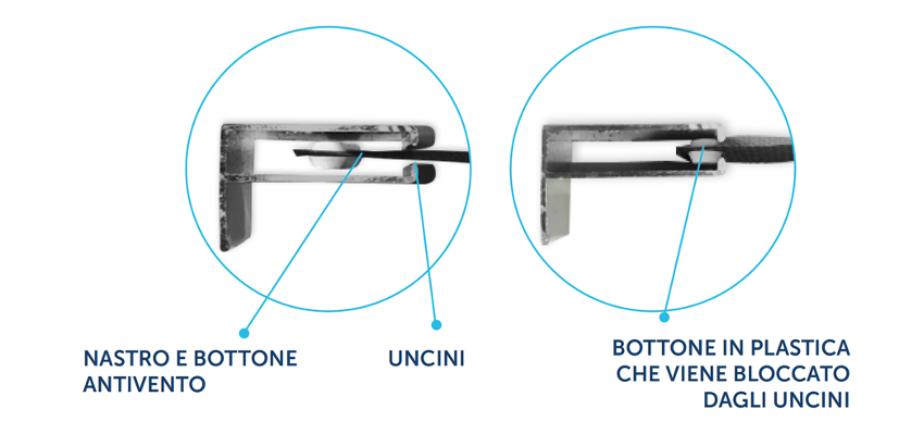 La particolare forma della guida con i due uncini fa in modo che il bottone non esca, in questo modo la rete rimane forzatamente dentro le guide anche in presenza di vento.
