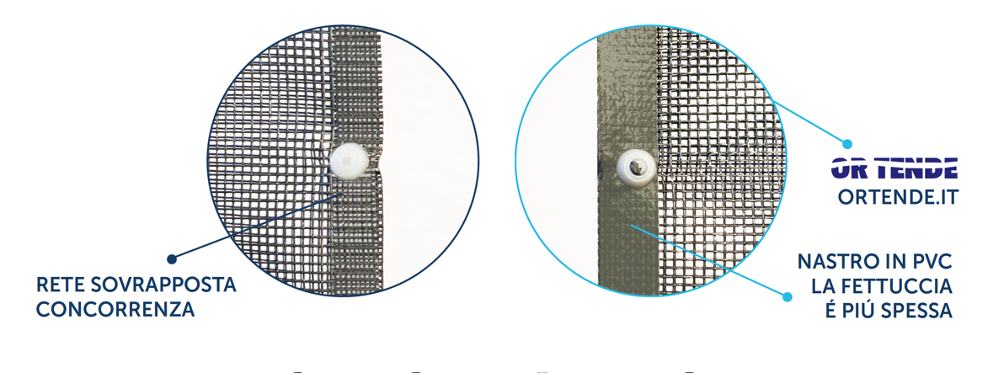 Il nastro in Pvc di cui sono dotate le zanzariere antivento proposte da OR Tende, costituisce un effettivo rinforzo di ancoraggio per i bottoncini.